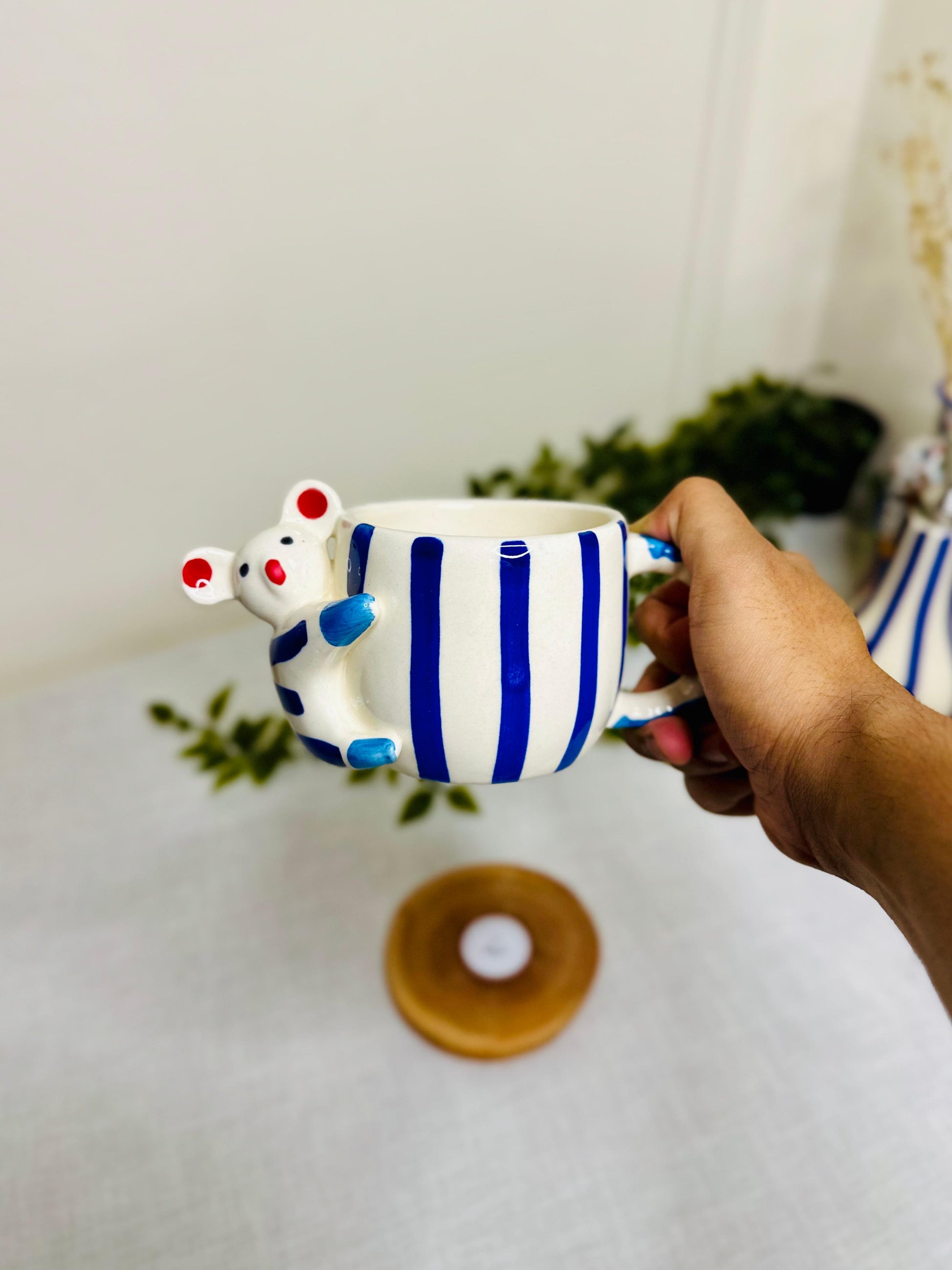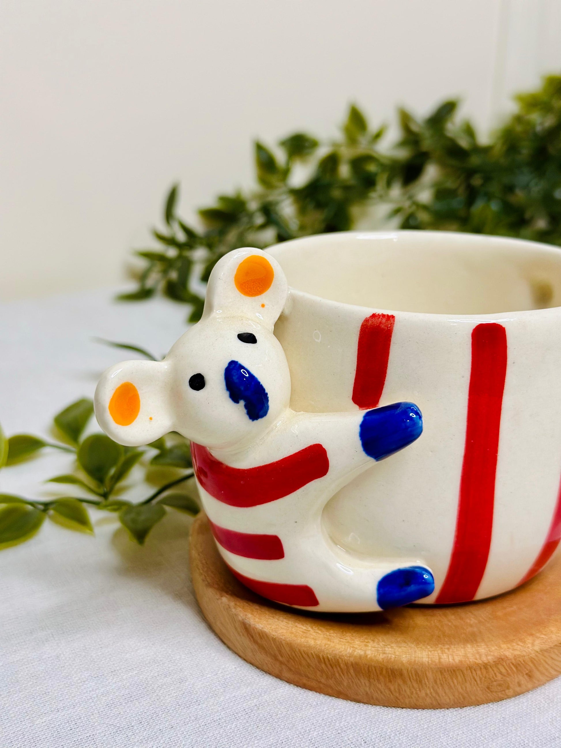 This charming cup is a true piece of functional art, boasting bold, hand-painted vertical stripes against a creamy white glaze. But the real star is the chunky, 3D Koala bear clinging playfully to the side of the cup. With its contrasting bright blue paws and orange-tipped ears, this little marsupial adds an unforgettable, whimsical touch to your coffee or tea break.