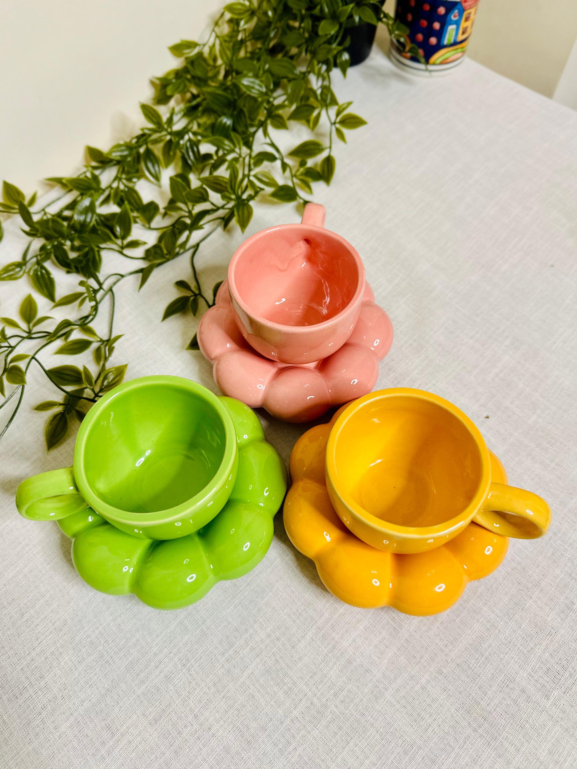 Brighten your day with this charming blush pink, Green, Orange ceramic cup, paired with a Bubble-shaped saucer Combo. Perfect for tea or coffee, it combines elegance and cheer in one delightful set. Ideal for daily use and as a thoughtful gift.