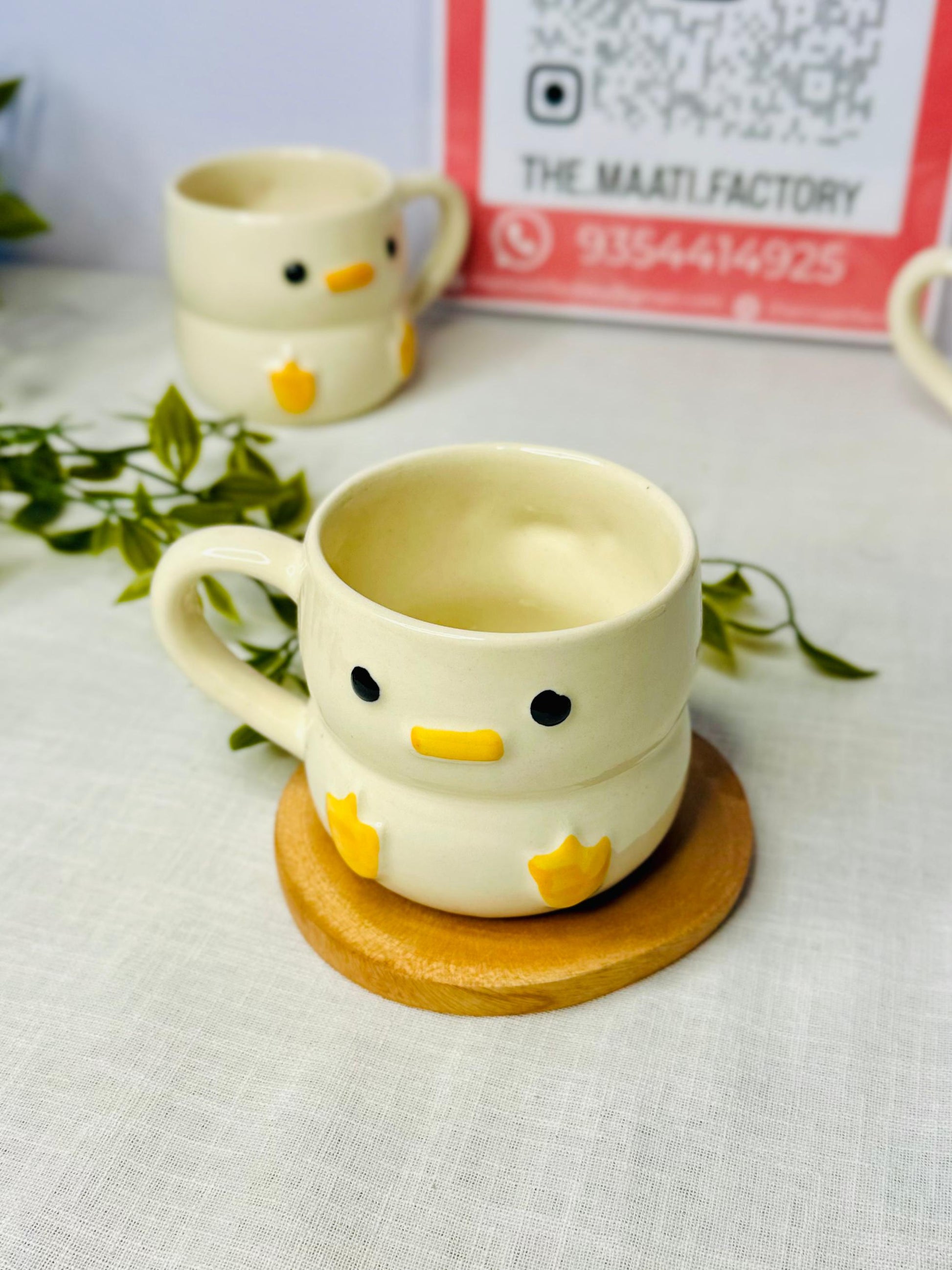 This unique cup features a simple, slightly chunky body in a creamy yellow glaze, decorated with bold 3D yellow webbed feet and a little yellow beak. Its large, innocent black dot eyes give it an utterly charming personality. This mug is perfect for an espresso, a small tea serving, or as a unique vessel for a tiny dessert. It’s an ideal gift for bird lovers or anyone who collects quirky, cute handmade pottery.
