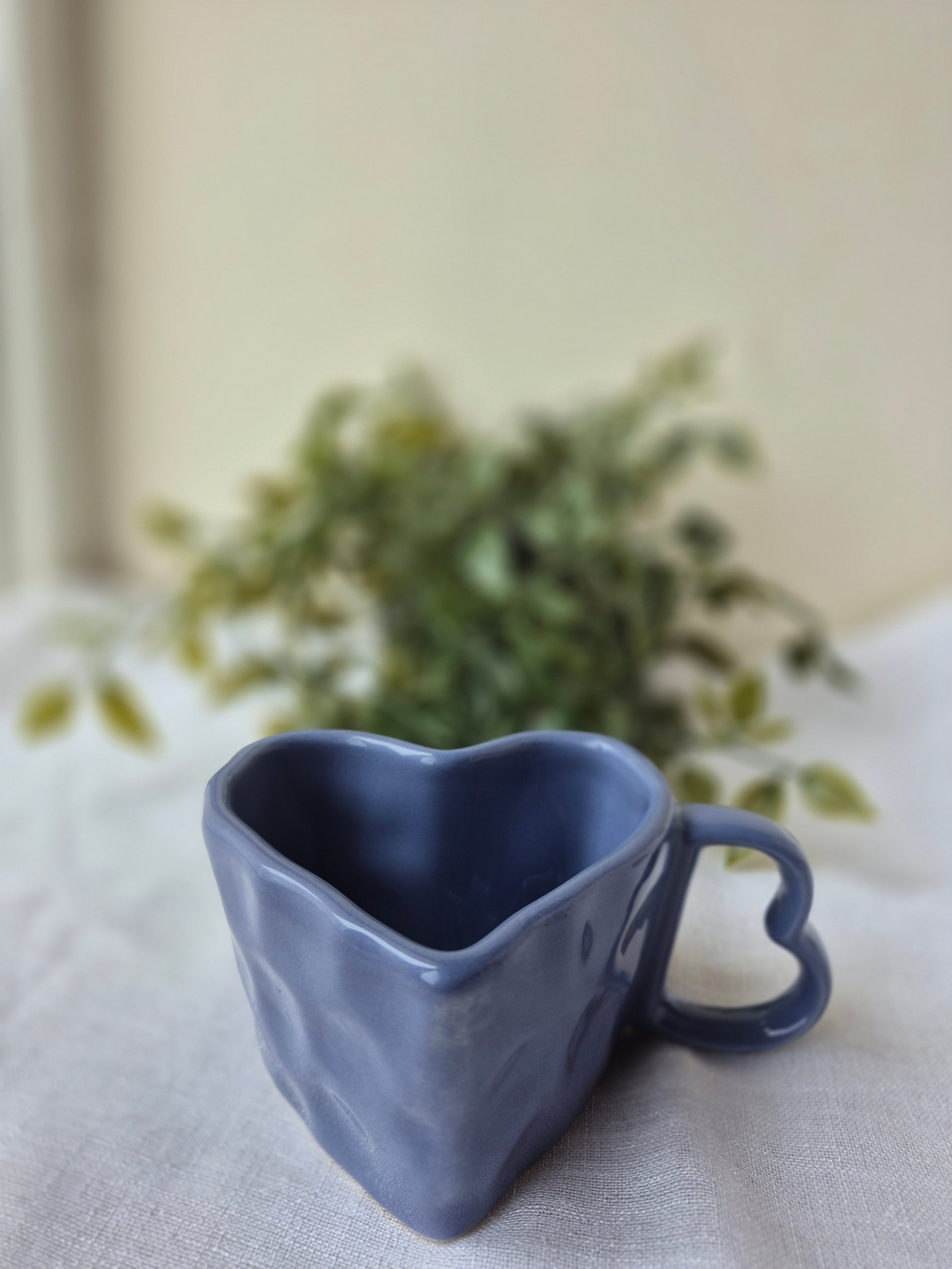 This unique cup is a true piece of functional art, featuring a striking heart-shaped rim and a handle that mirrors the same loving shape. The body of the mug boasts a lovely, irregularly textured surface that feels wonderfully tactile in your hands. Finished in a sophisticated dusty indigo or muted periwinkle blue glaze, this color is both calming and contemporary.
