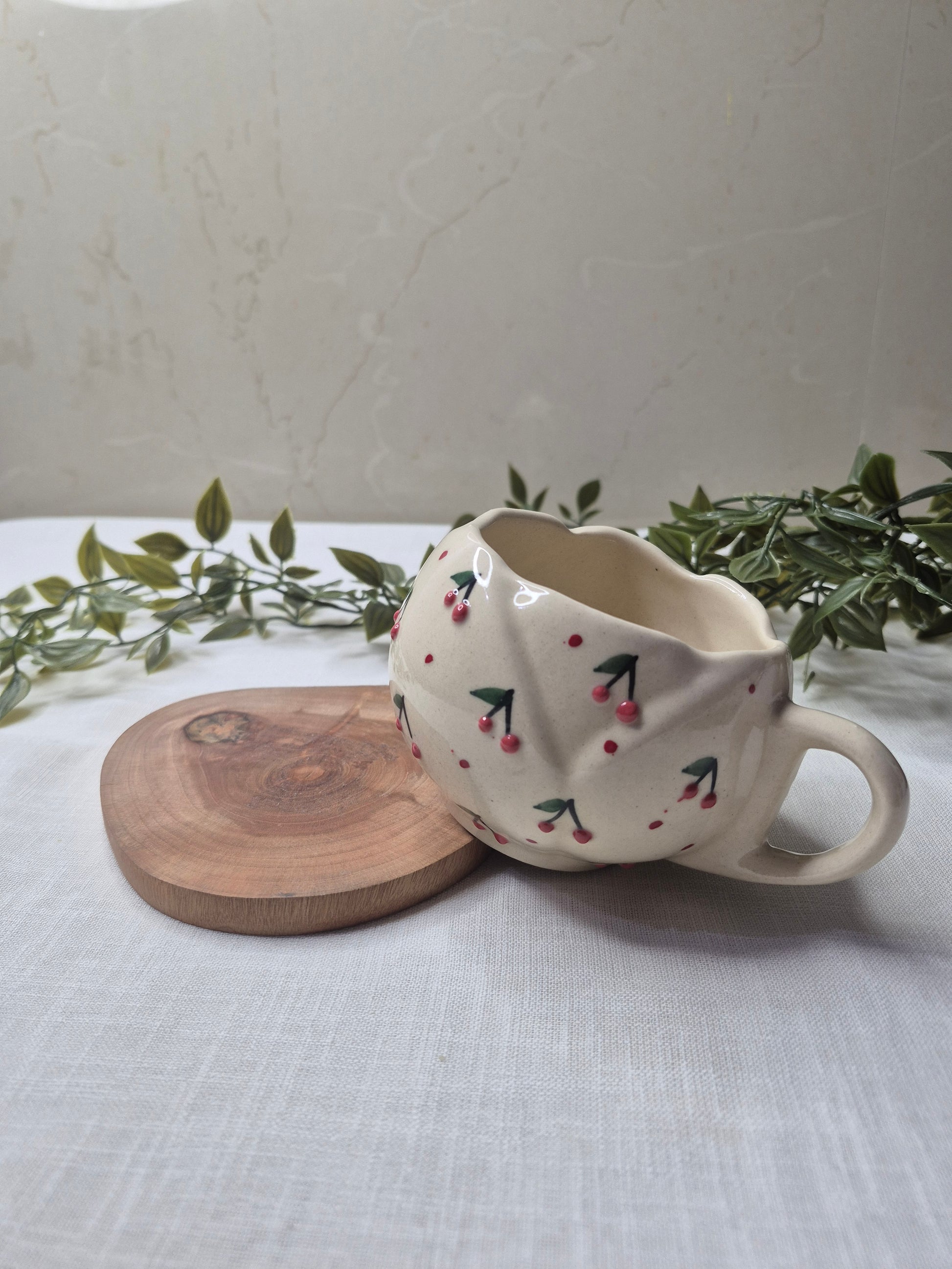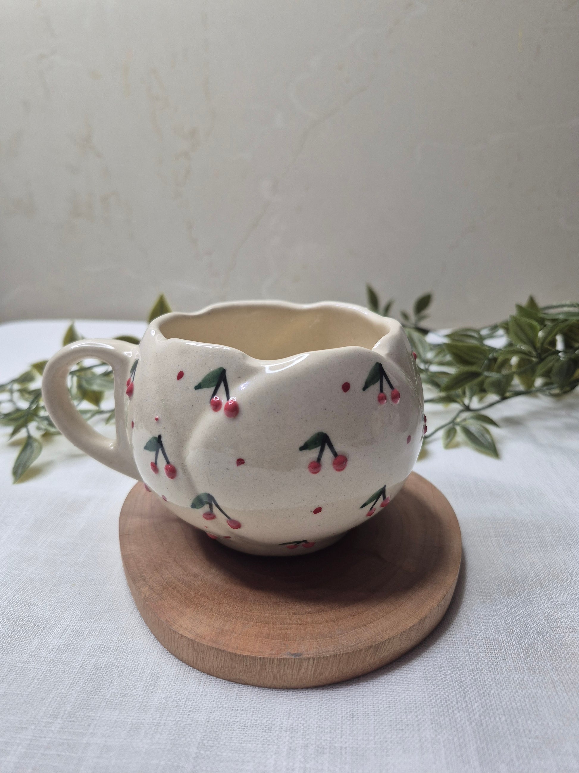 Sip your favorite beverage with a dash of rustic charm! This delightful handmade ceramic mug features an abundance of sweet, hand-painted red cherries with subtle green stems, reminiscent of a bountiful cherry orchard.
